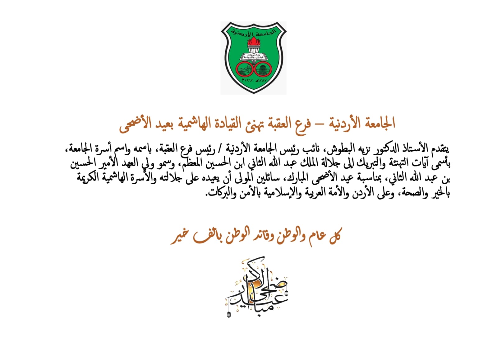 : الجامعة الأردنية فرع العقبة تهنئ القيادة الهاشمية بعيد الاضحى