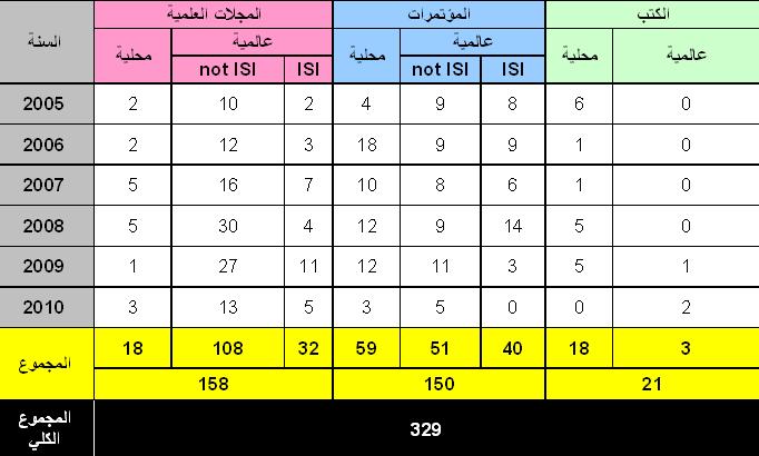 توضح الجداول والرسوم البيانية المرفقة تطور ونمو مخرجات البحث العلمي بالكلية ممثلة بعدد الأعمال المنشورة على النطاقين الإقليمي والدولي من قبل أعضاء الهيئة التدريسية في كلية الملك عبد الله الثاني لتكنولوجيا المعلومات من عام (2005 ولغاية 2010) .