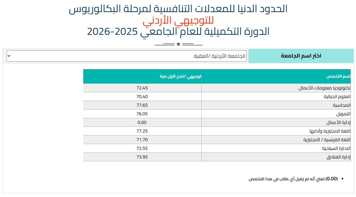 قرر مجلس التعليم العالي الموافقة على السماح لفرع الجامعة الأردنية/العقبة قبول الطلبة الأردنيين الحاصلين على الثانوية العامة الأردنية /الدورة التكميلية (2026) قبولاً مباشراً على البرنامج العادي لدرجة البكالوريوس للفصل الدراسي الثاني للعام الجامعي (2025-2026)، وذلك ضمن الحدود الدنيا لمعدلات القبول التنافسية للدورة التكميلية للعام الجامعي (2025-2026)، وحسب الشواغر التي أقرها مجلس التعليم العالي